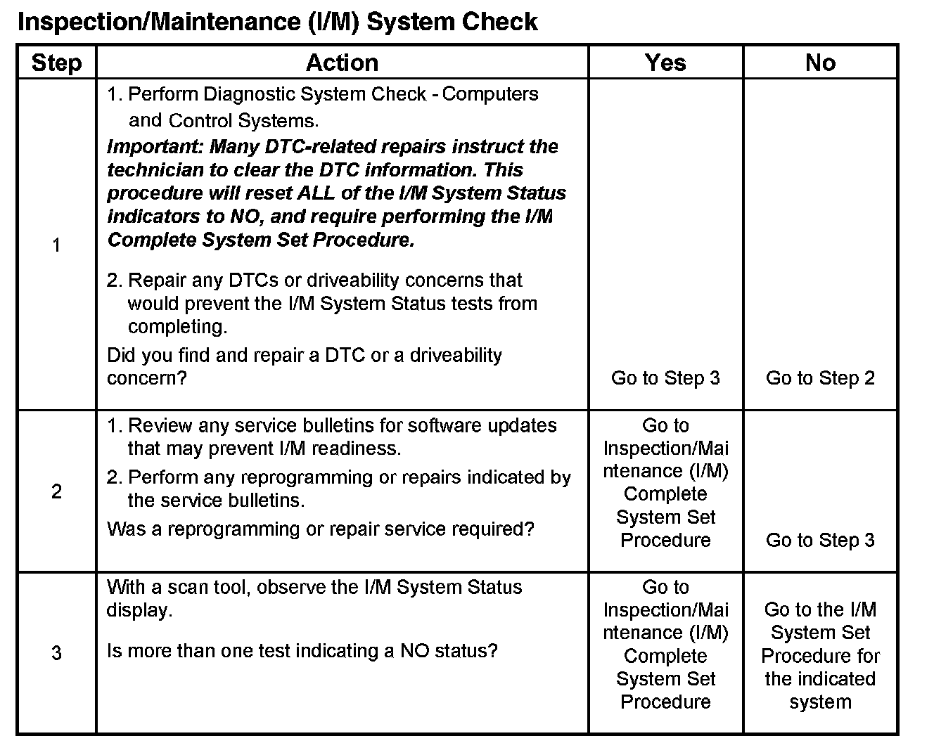1. Any DTCs that set, even DTCs that are not listed in the Inspection/Maintenance System DTC Table, may prevent the required DTCs from running. If there is any question as to whether a set DTC is disabling the required I/M diagnostic, review the Conditions for Running in the diagnostic procedures for the DTC that is required by the I/M diagnostic. A list of disabling DTCs, if applicable, is in the supporting text for that DTC.