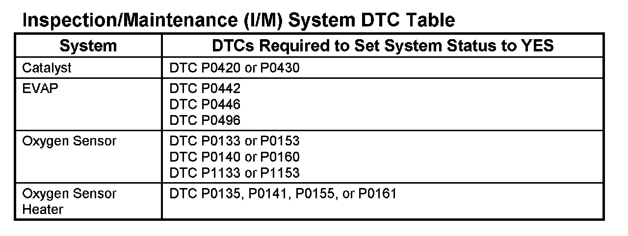 Inspection/Maintenance (I/M) System DTC Table: