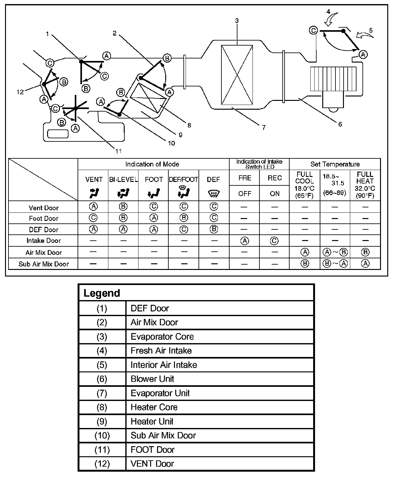 Automatic switching between outside air (FRESH), recirculated inside air (RECIRC), or a combination of the two (MIX) occurs in response to changes in outlet temperatures. The intake switch permits manual selection of the air source (FRESH or RECIRC). Mixing of the two sources is not possible during manual operation. When the defrost mode switch (DEF) is pressed, the system automatically switches to outside air intake.