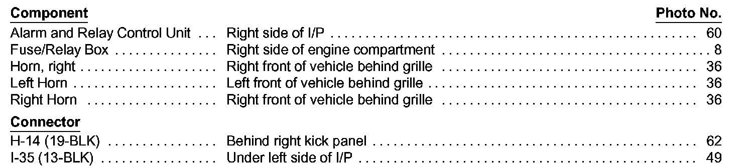 Horns Component Location Index: