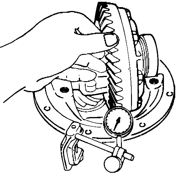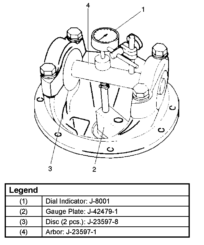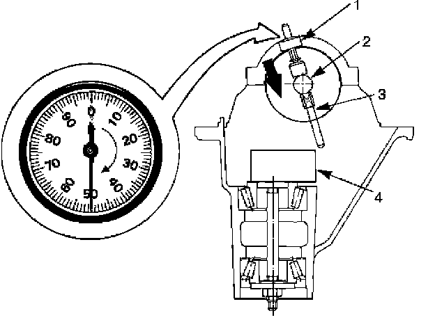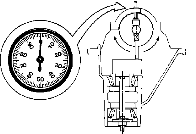 3. Clean the side bearing bores. Install the dial indicator with the discs and arbor. Install and tighten the bearing caps to the specified torque.