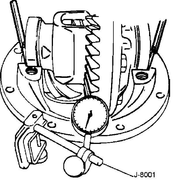 Mount the dial indicator J-8001 on the carrier so that the indicator stem is at right angles to a tooth on the ring gear.