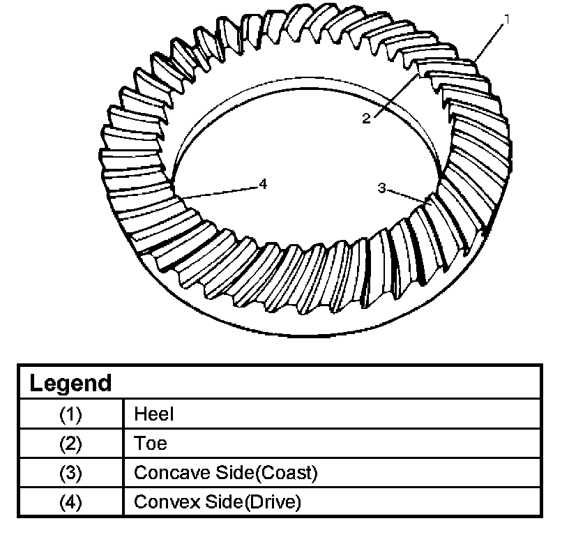 1. Apply a thin coat of Prussian blue or equivalent to at least 7-8 ring gear teeth. Rotate the ring gear and inspect the contact point of the impressions and make the necessary adjustments as described in the next page.