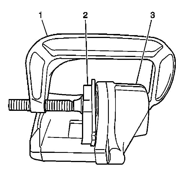 ^ For single piston caliper applications, insert a discarded inner brake pad (2) or block of wood in front of the piston. Using a large C-clamp (1) installed over the body of the caliper (3) and against the brake pad or block of wood, slowly bottom the piston in the bore.