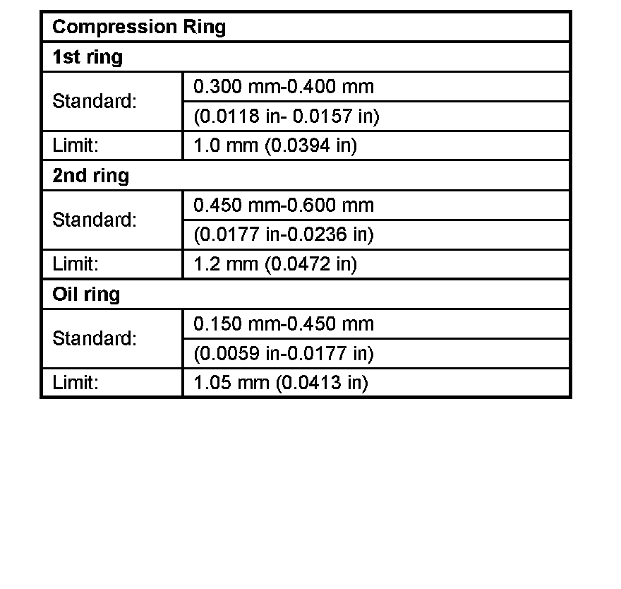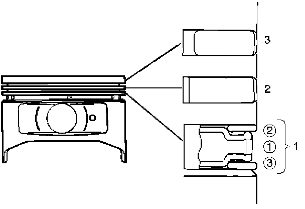 2. Measure the clearance between the piston ring groove and the piston ring with a feeler gauge. If the piston ring groove / piston ring clearance exceeds the specified limit, the piston must be replaced.