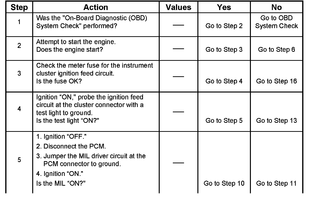 - If the engine runs OK, check for a faulty light bulb, an open in the MIL driver circuit, or an open in the instrument cluster ignition feed.