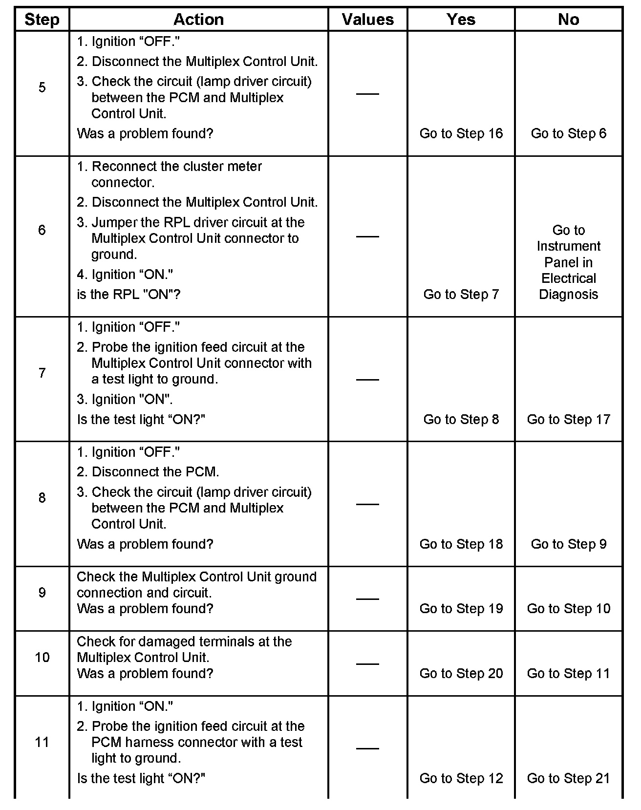 9. Using a test light connected to B+, probe each of the Multiplex Control Unit ground terminals to ensure that a good ground is present. Refer to Multiplex Control Unit Terminal End View for terminal locations of the Multiplex Control Unit ground circuits.