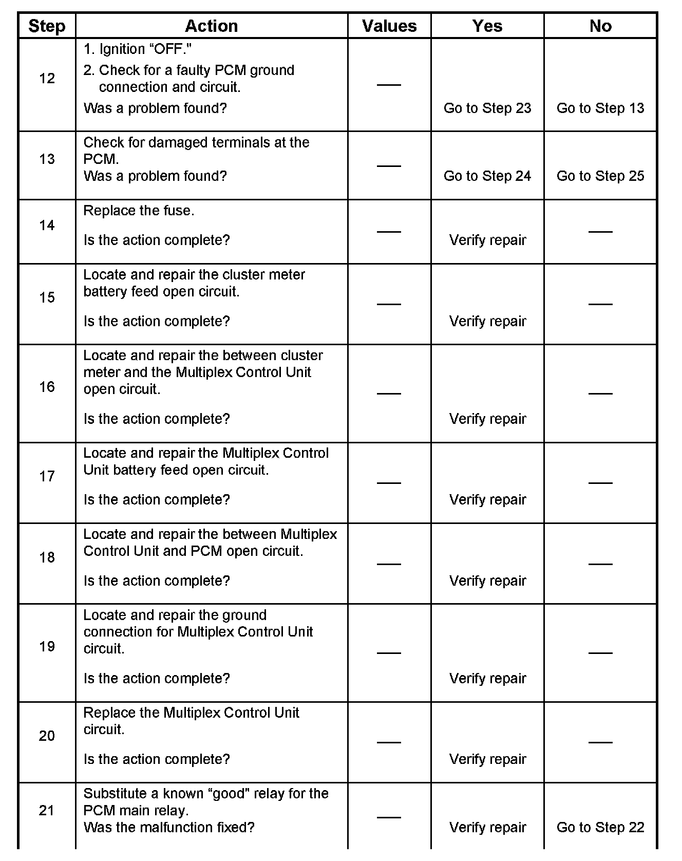 21. In this step, temporarily substitute a known good relay for the PCM relay. The horn relay is nearby, and it can be verified as "good" simply by honking the horn. Replace the horn relay after completing this step.