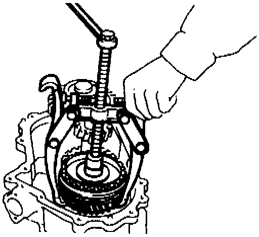 Use the universal puller to remove the high-low clutch hub (17) and transfer input gear (18).