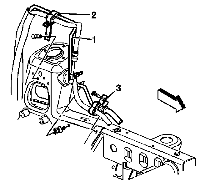 10. Remove the power steering hose assembly (1) front bracket mounting bolt (3).