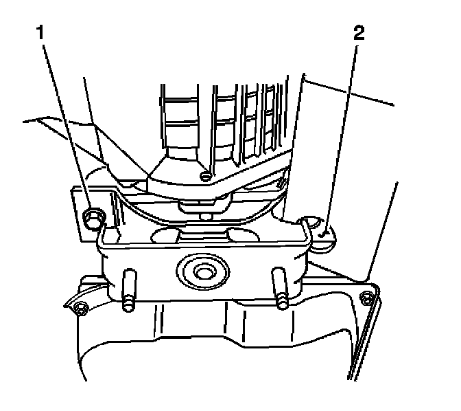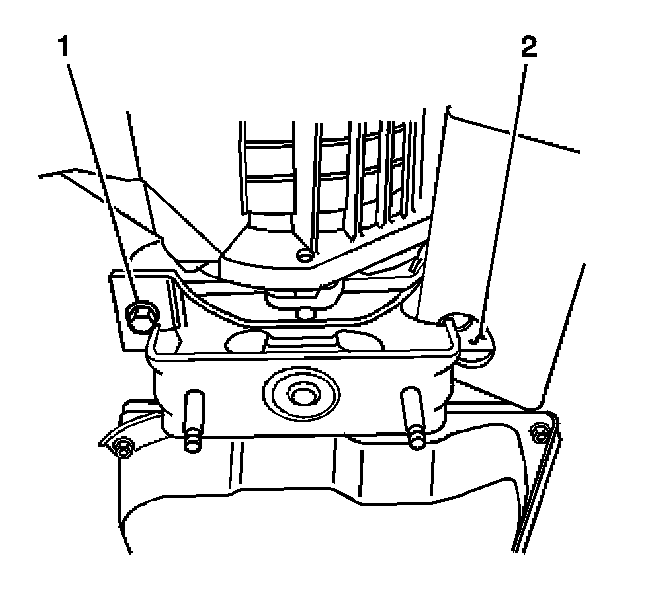 2. Install the bolts (1,2) securing the transmission mount to the transmission.