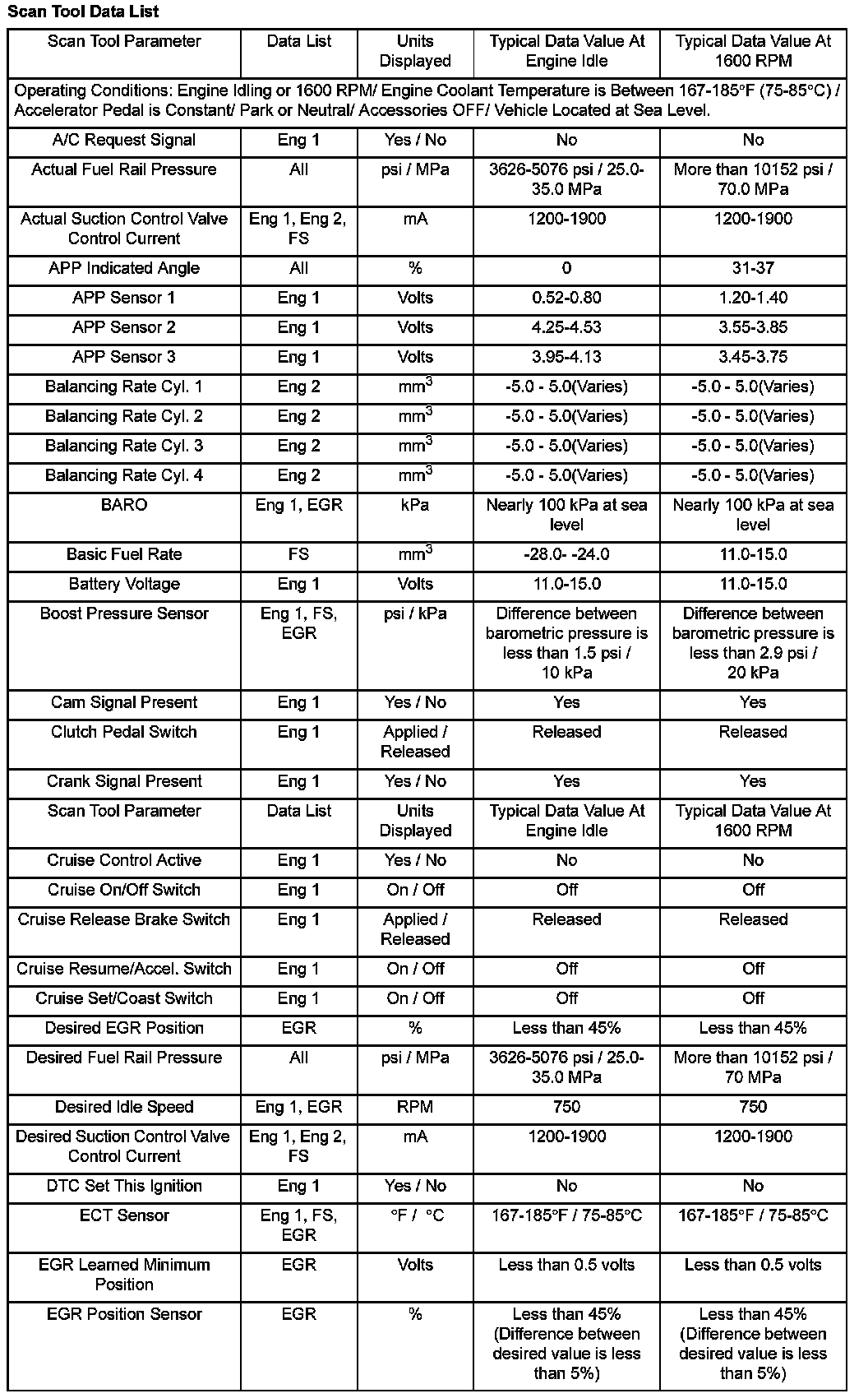 Scan tool values from a properly running engine may be used for comparison with the engine you are diagnosing. The Engine Scan Tool Data List represents values that would be seen on a normal running engine.