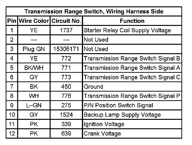 Transmission Range Switch, Wiring Harness Side: