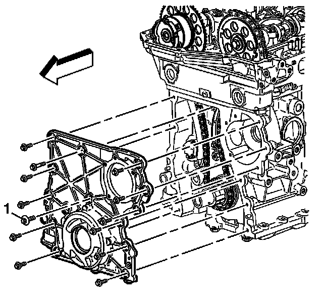 4. Apply a 3 mm (0.12 in) bead of sealer GM P/N United States 12378521, GM P/N Canada 88901148 to the back side of the engine front cover (1).