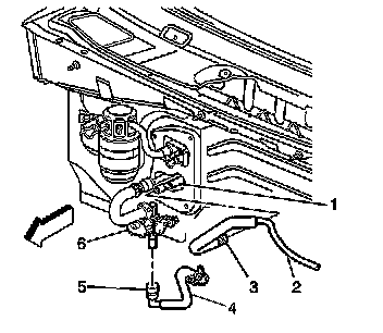 1. Install the J 43181 to the quick connect on the outlet heater core hose (2).
