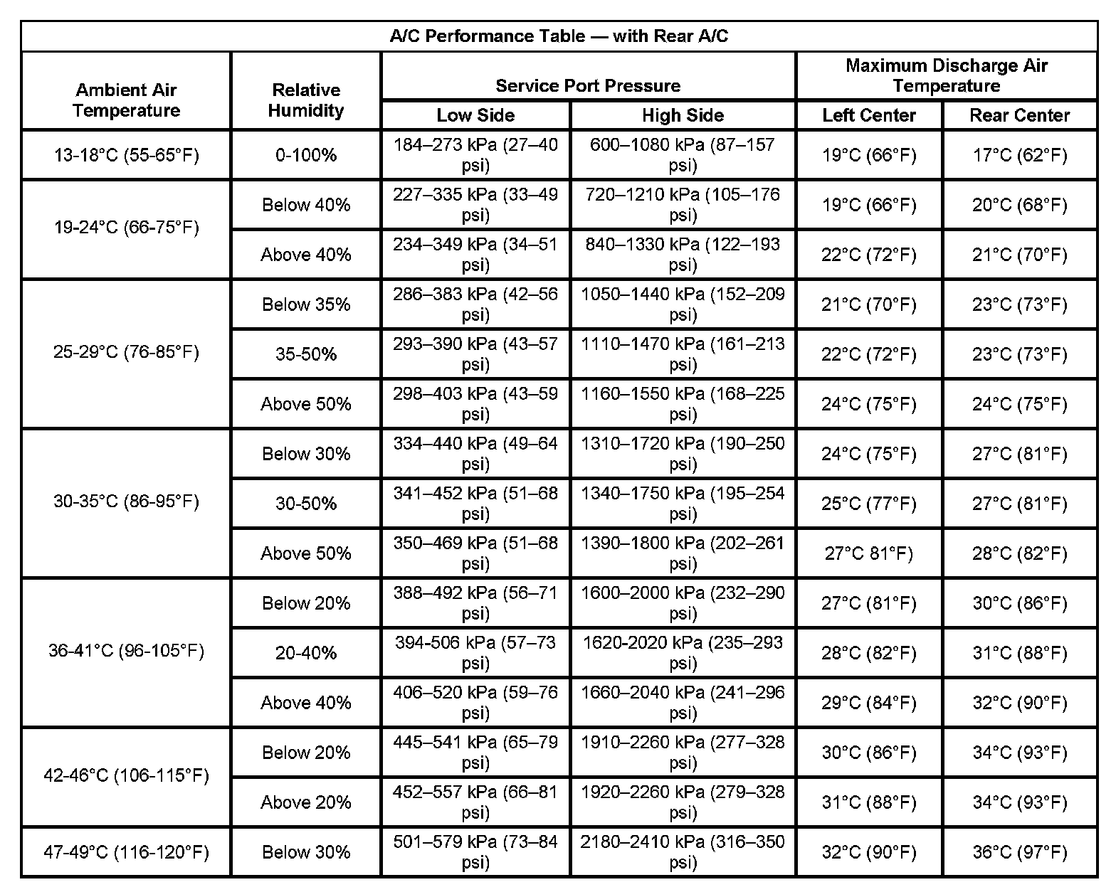 A/C Performance Table - With Rear A/C: