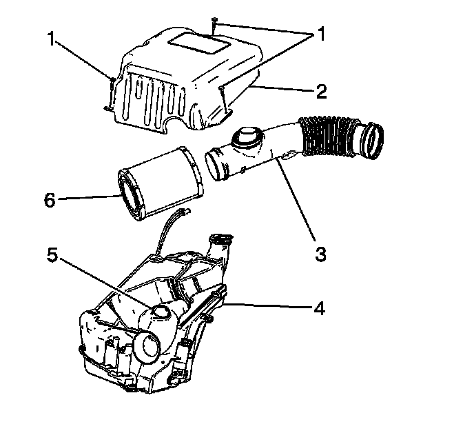 8. Install the air cleaner element (6) and air outlet duct (3) to the lower air cleaner housing/washer solvent tank assembly.