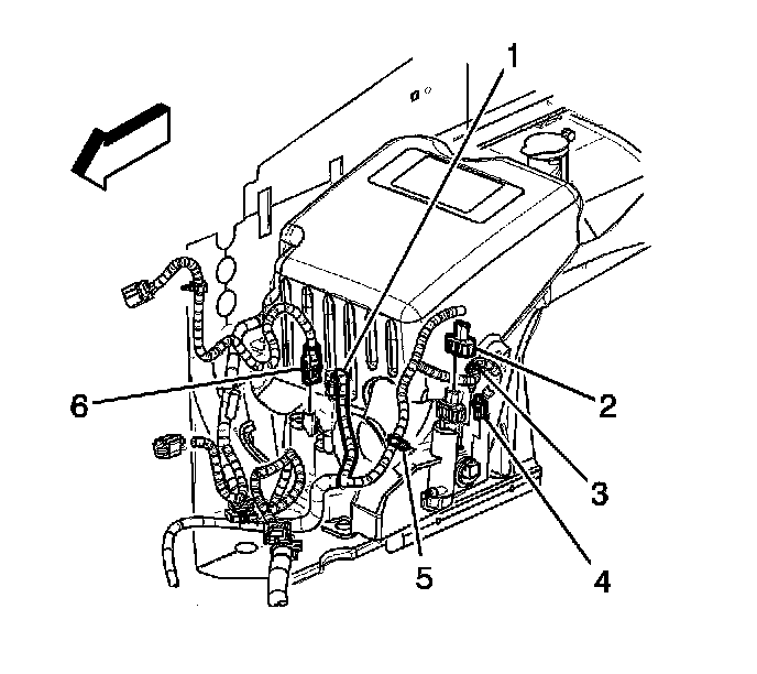 4. Remove the washer solvent level sensor wire harness from the wire harness retaining clips (3, 5).