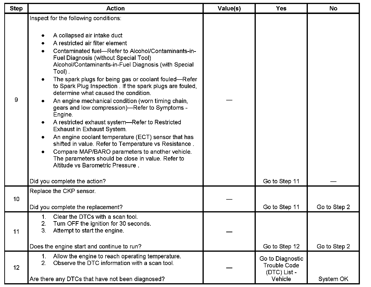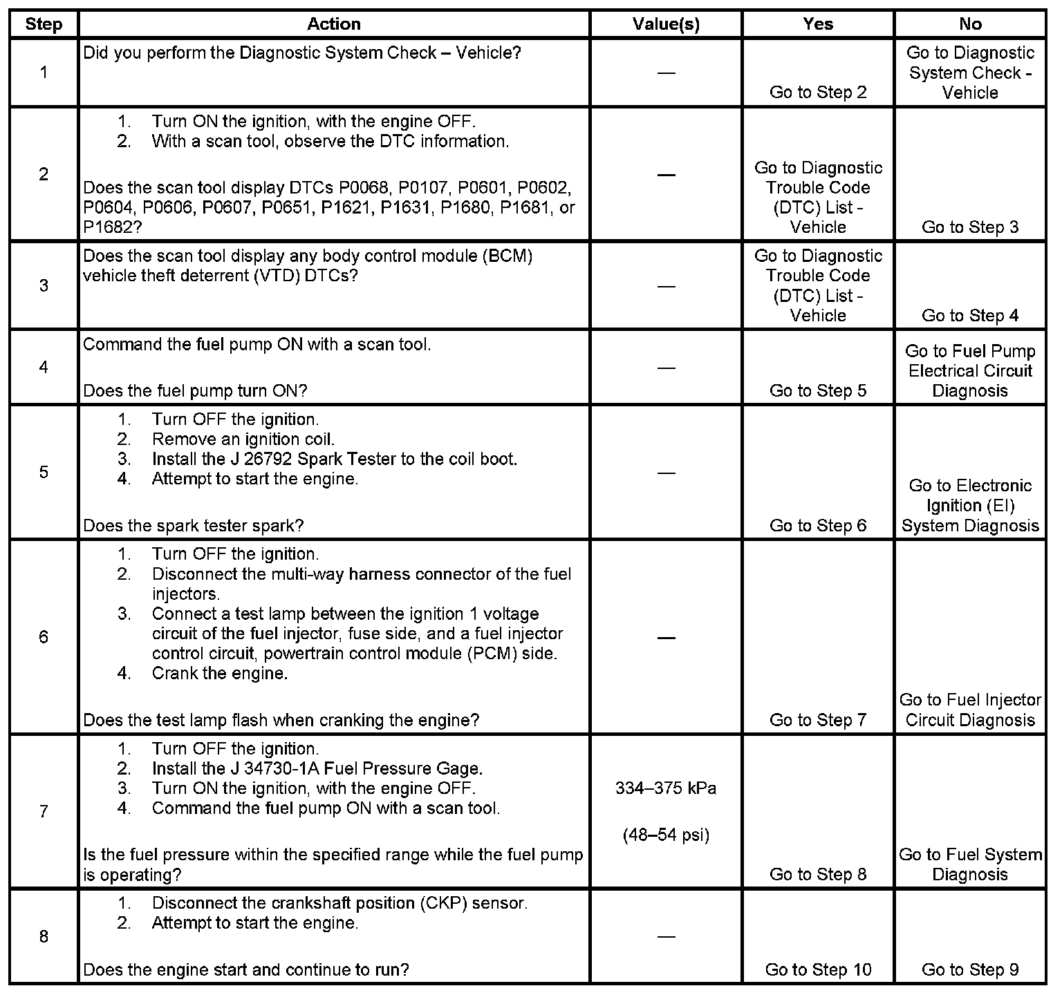 The Engine Cranks but Does Not Run diagnostic table is an organized approach to identifying a condition that causes an engine not to start. The Engine Cranks but Does Not Run diagnostic table directs the service technician to the appropriate system diagnosis.