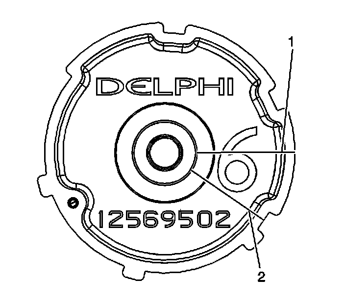 5. Scribe or draw a line (2) on the camshaft position actuator at that position.