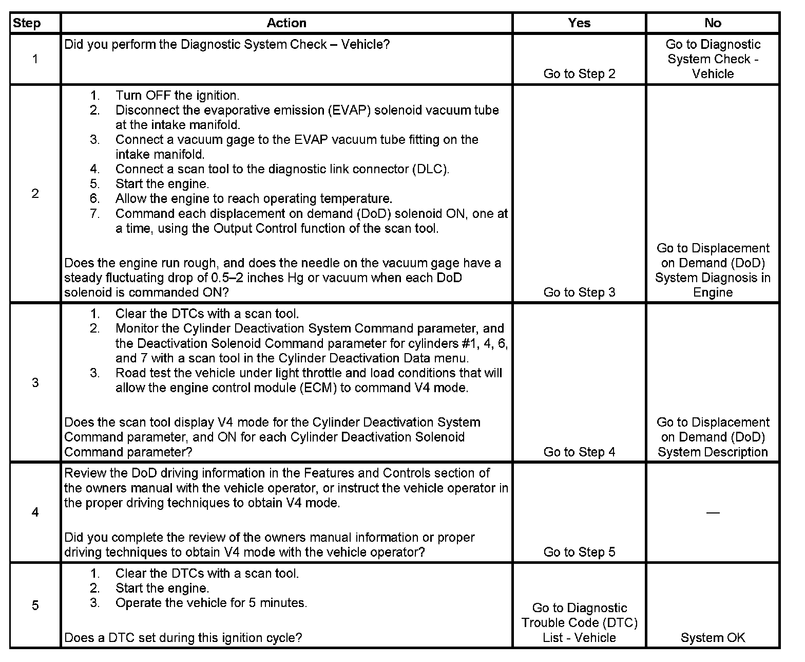 3. Perform a road test while monitoring the cylinder deactivation data parameters with a scan tool. If the engine does not switch to a V4 mode, then review the inhibit reasons listed in the DoD system description.