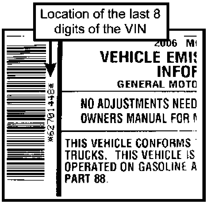 1. The emission labels are VIN-specific and unique to each vehicle. Each emission label is coded with the last 8 digits of the VIN for the vehicle affected by this bulletin, located next to the bar code. Match the VIN-specific label to the VIN of the vehicle and set aside. If the correct emission label is not found, contact Isuzu Owner Relations at 800-255-6727. After appointment is made with customer, Isuzu will provide you (the dealership) with the specific emission label that is applicable to your customer's vehicle.