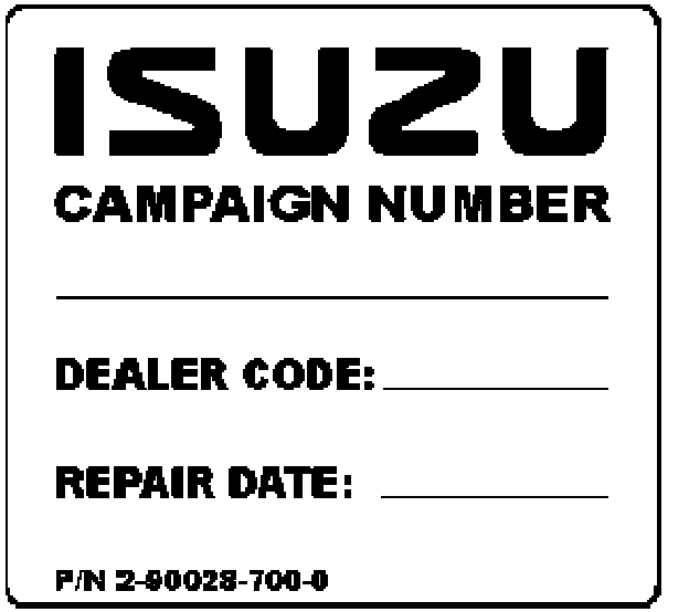 Affix the campaign label P/N 2-90028-700-0 adjacent to the manufacturer's identification label located inside the driver's door. Using a ballpoint pen, fill in the label following "Campaign Number" with the text "EMISSIONS LABEL/CALIBRATION", as well as your Isuzu dealer code and the repair date.