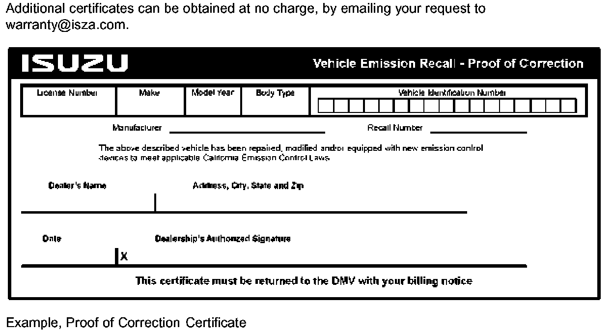 When a California emissions campaign is completed by an Isuzu dealer, the dealer must provide the vehicle owner a "Proof of Correction Certificate", which the owner may need to present to the California Department of Motor Vehicles (DMV) when renewing their vehicle registration. Without this correction certificate, the owner may be unable to renew their vehicle registration. As set forth in the sample owner notification letter, the owner will need to submit the correction certificate to the DMV only if the DMV requests it. Otherwise, we recommend that owners keep the certificate for their records.
