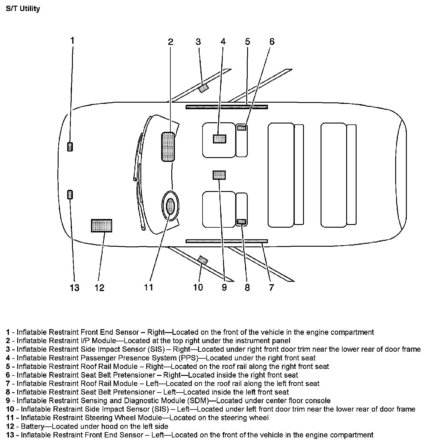 The SIR Identification Views shown above illustrate the approximate location of all SIR components available for the vehicle. This will assist in determining the appropriate SIR Disabling and Enabling for a given service procedure, refer to SIR Disabling and Enabling.