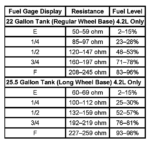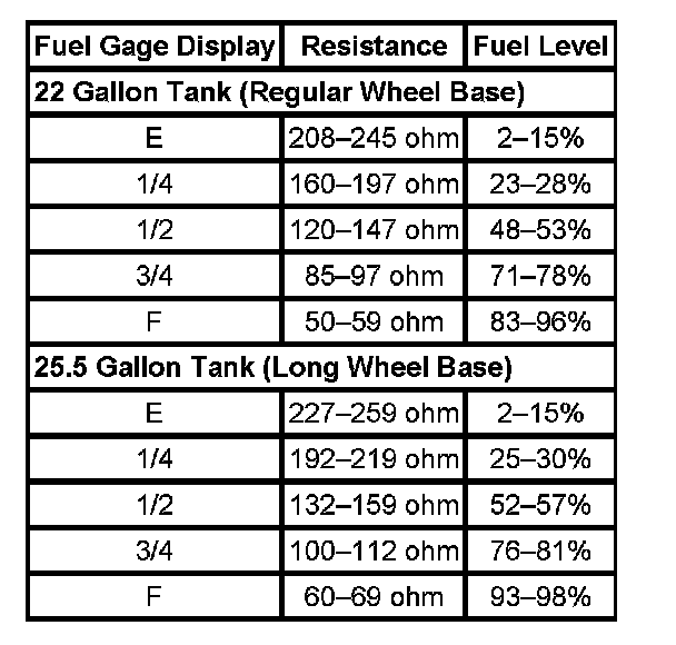 The information in this table is intended for use with the J 33431-C Signal Generator and Instrument Panel Tester. The fuel level sensor values represent the test values to be used on the Signal Generator to drive the fuel gage display to the indicated positions. Vehicles that require more than one fuel level sensor calculate gage position from many possible resistance combinations of fuel levels between the two tanks. Therefore, the values in the table may not correlate directly to readings taken from the vehicle primary or secondary sending units.