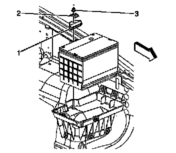 8. Remove the battery hold down nut (3), retainer (1), and washer.