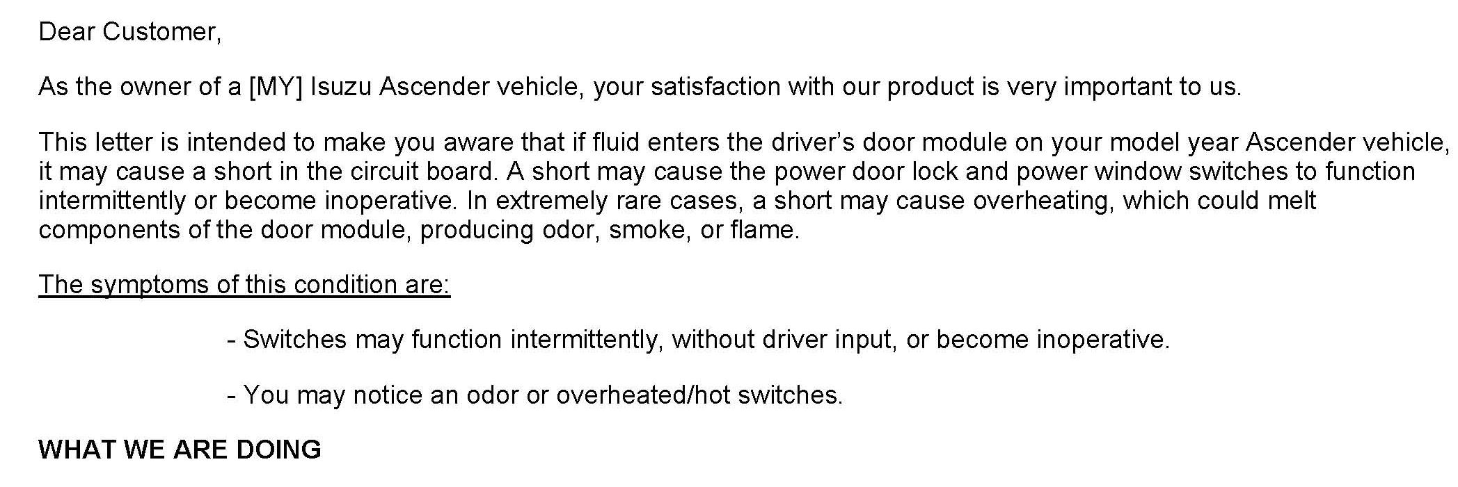On some 2006-2007 model year Isuzu Ascender vehicles, if fluid enters the drivers door module, it may cause a short in the circuit board. A short may cause the power door lock and power window switches to function intermittently or become inoperative. In extremely rare cases, a short may cause overheating, which could melt components of the door module,