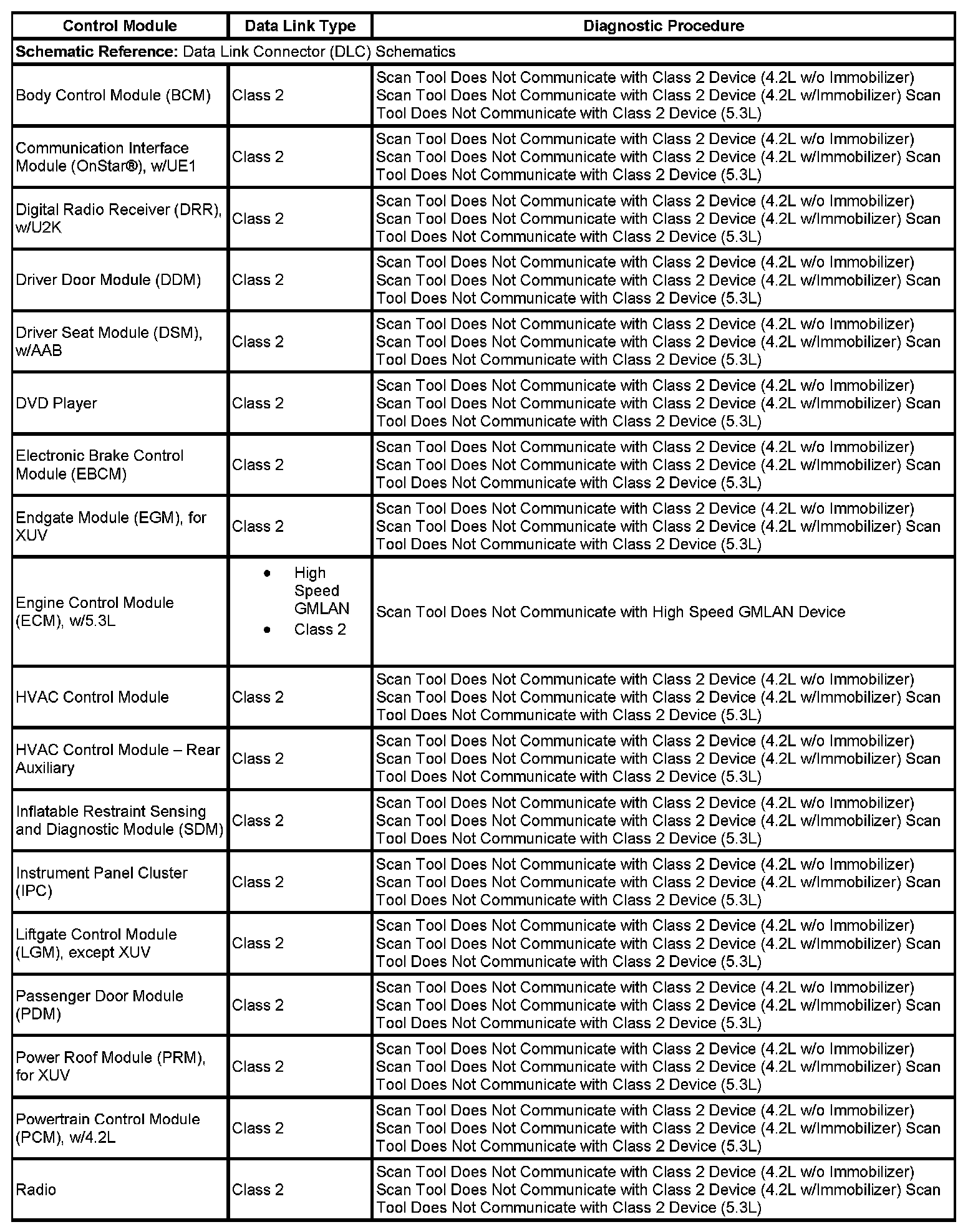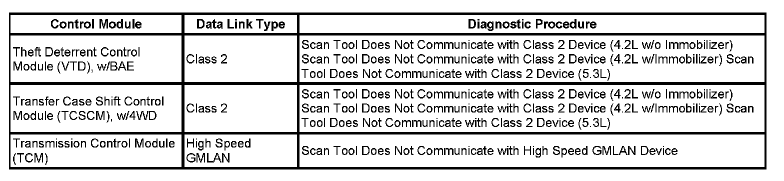This table identifies which serial data link that a particular module uses for in-vehicle data transmission. Some modules may use more than one data link to communicate. Some modules may have multiple communication circuits passing through them without actively communicating on that data link. This table is used to assist in correcting a communication malfunction. For the description and operation of these serial data communication circuits refer to Data Link Communications Description and Operation.