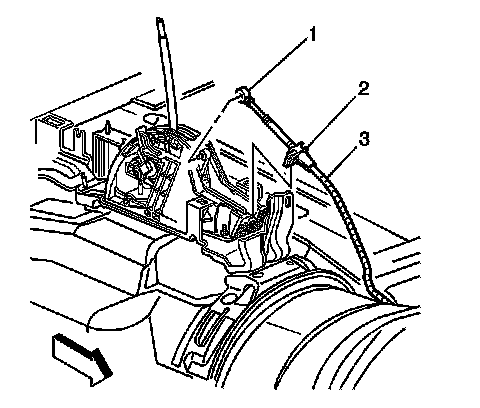3. Remove the end of the range selector cable (1) from the transmission control ball stud.