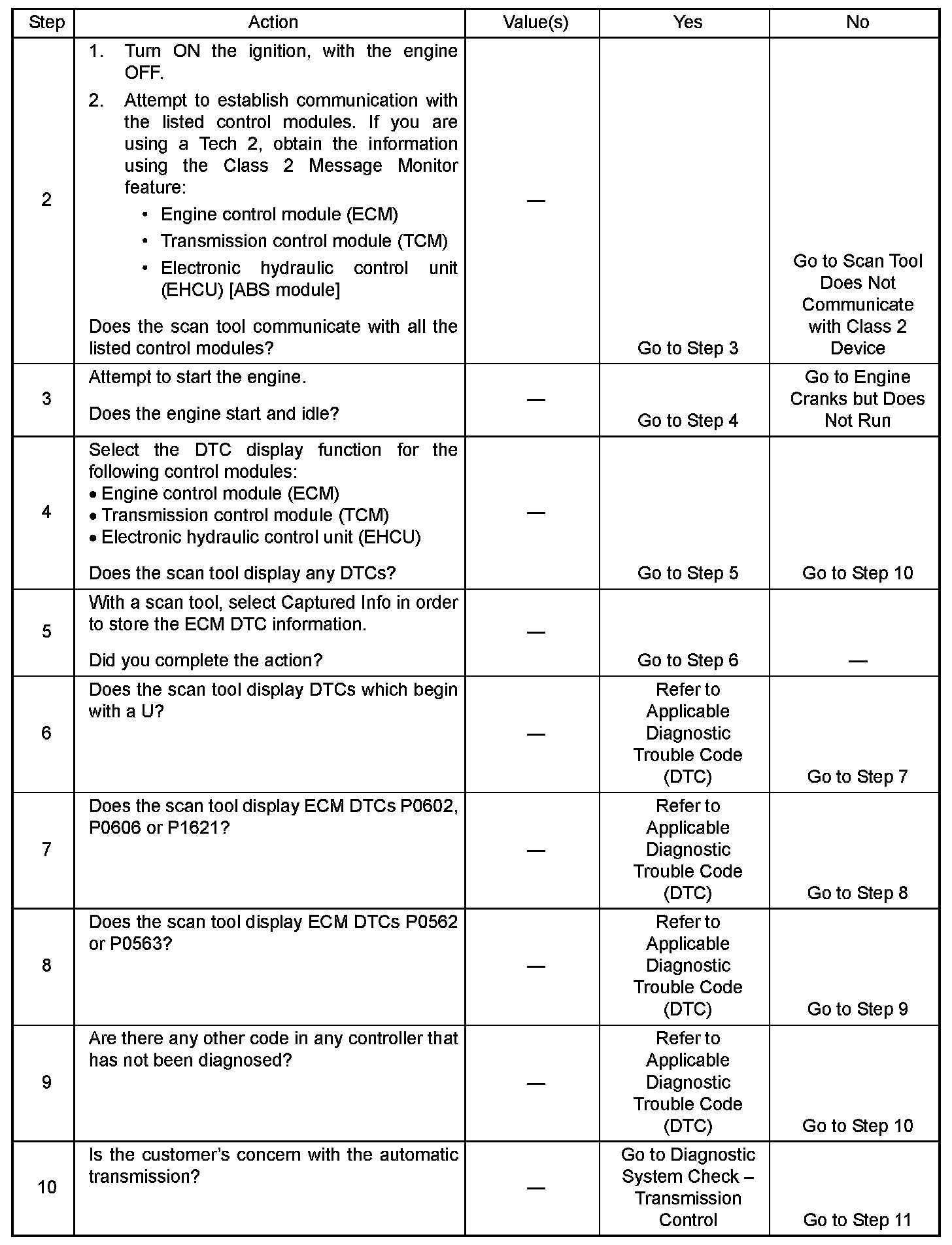 2. Lack of communication may be because of a partial or a total malfunction of the class 2 serial data circuit. The specified procedure determines the particular condition.