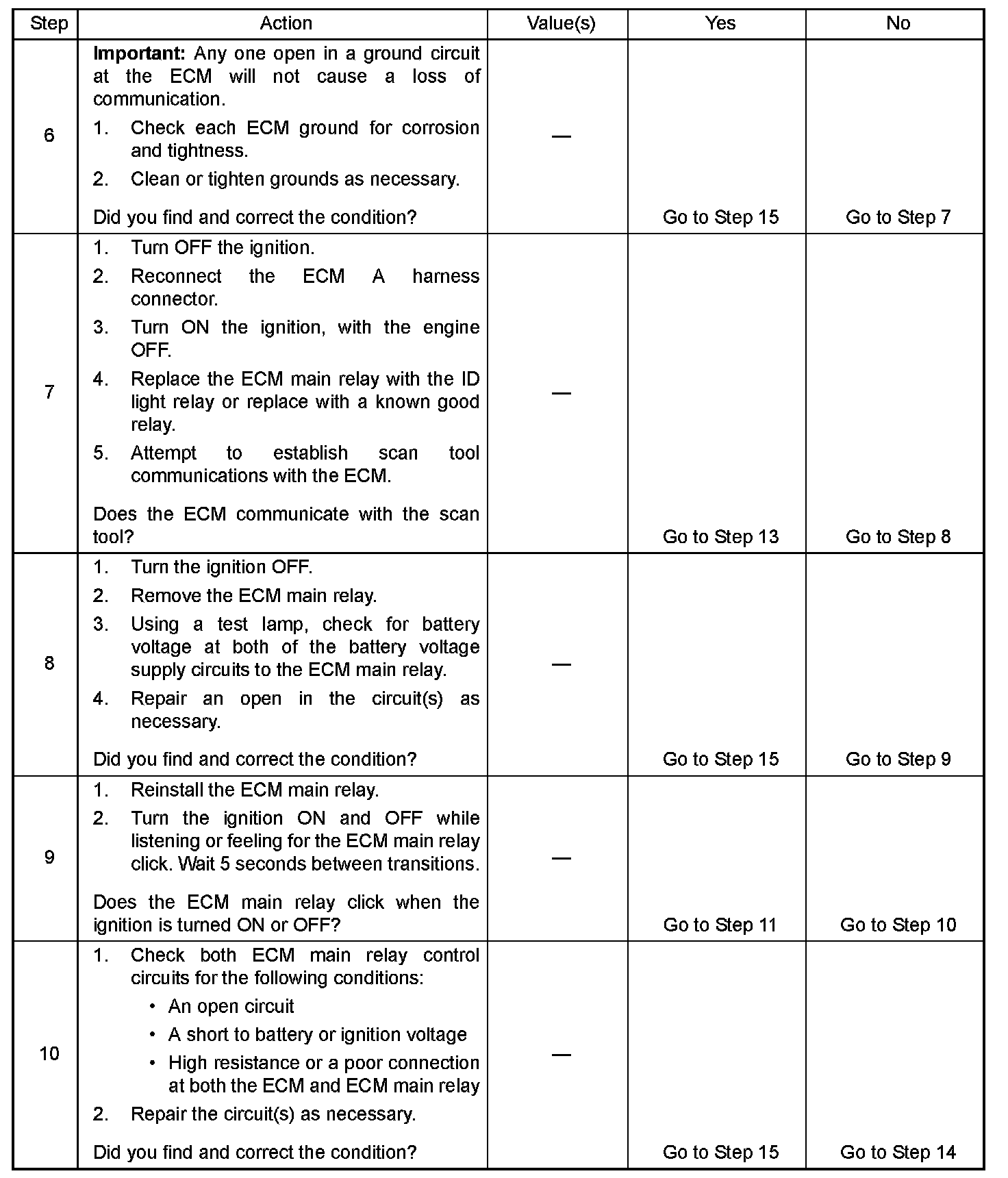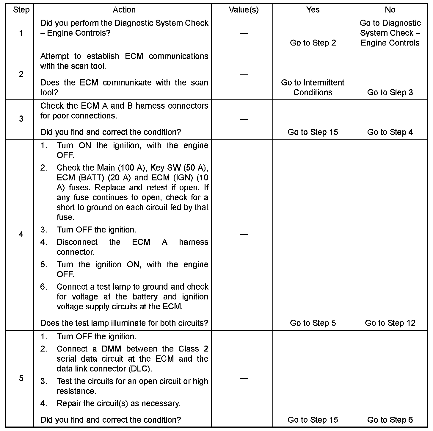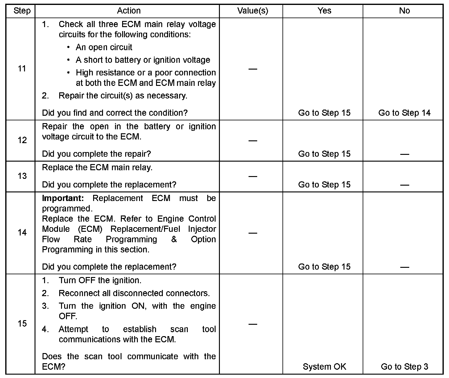 NOTE: If the battery supply voltage at the ECM (pin A-51) is lost, the ECM will still communicate with the scan tool and the engine will start and run normally. If ECM main relay voltage to the ECM is lost (must lose-voltage on all three ECM main relay power circuits), the scan tool will not communicate with the ECM.
