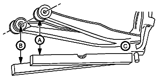 2. Set the top edge of the level on the reference surface of the steering knuckle (c) and extend the level directly under the rear end of the front attachment bolt of the lower control arm (a).