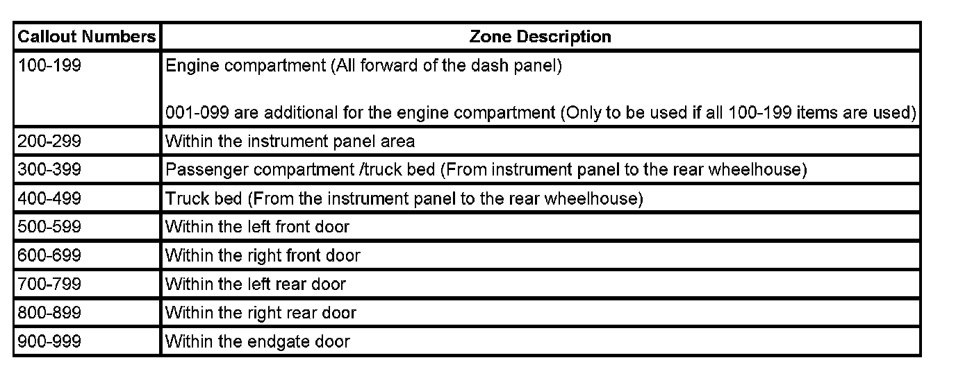 All grounds, in-line connectors, pass-through grommets, and splices have identifying numbers that corresponds to where they are located in the vehicle. The following table explains the numbering system.