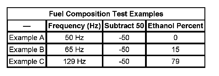 3. Subtract 50 from the reading on the DMM in order to obtain the percentage of alcohol in the fuel sample. Refer to the examples in the Fuel Composition Test Examples table.