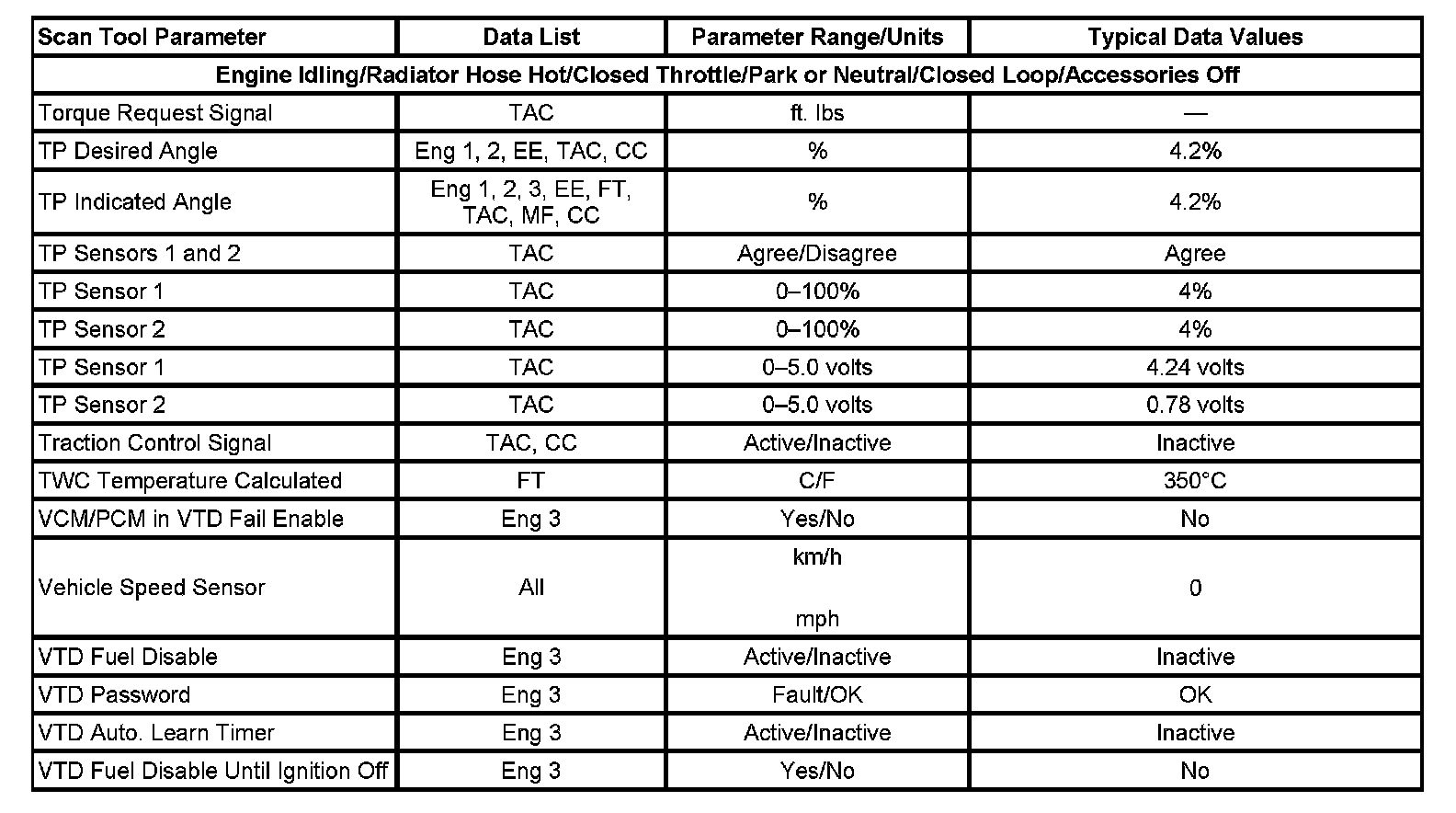 Only the parameters listed below are referenced in this service data for use in diagnosis. If all values are within the typical range described below, refer to Symptoms - Computers and Control Systems for diagnosis. Symptom Index
