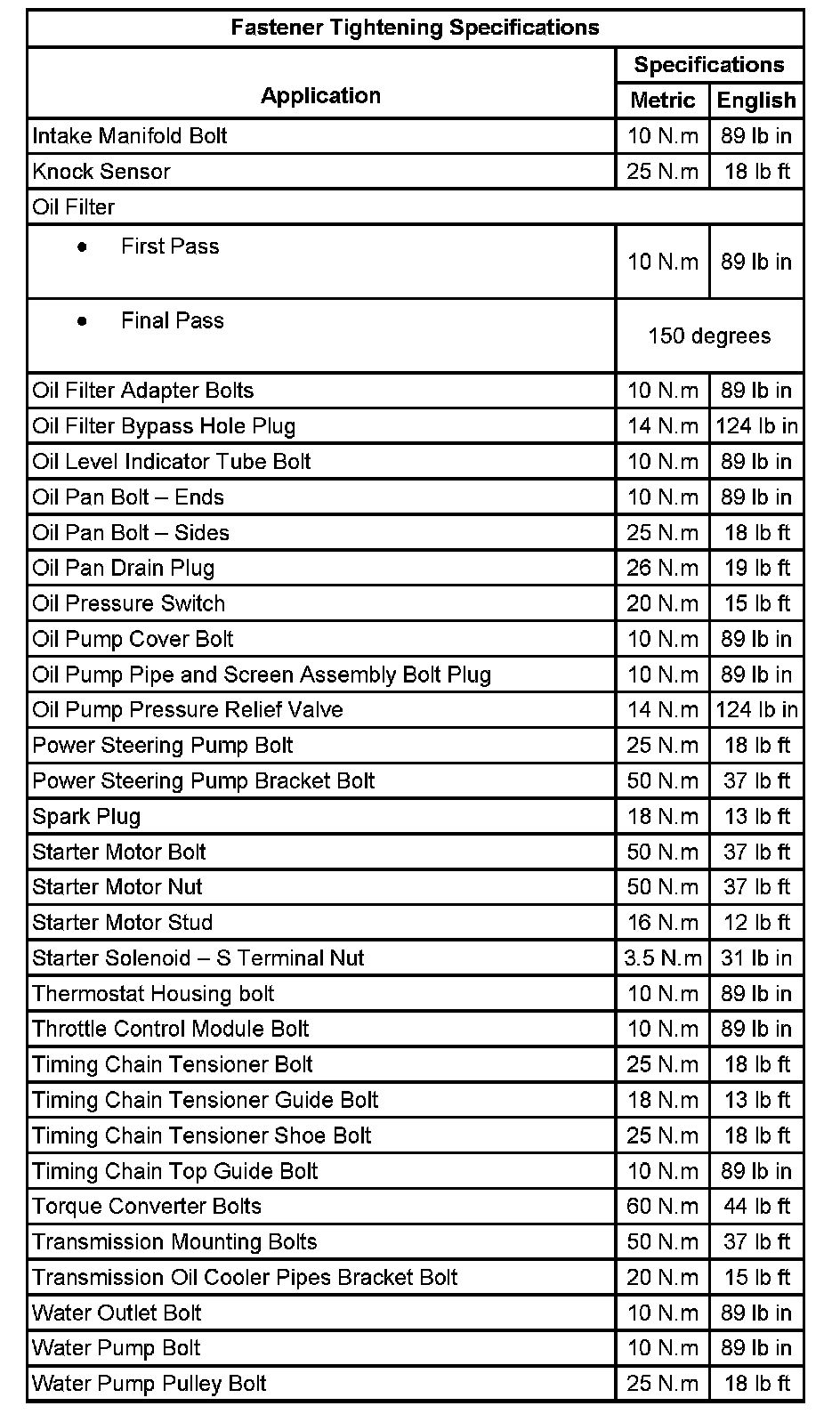 Fastener Tightening Specifications: