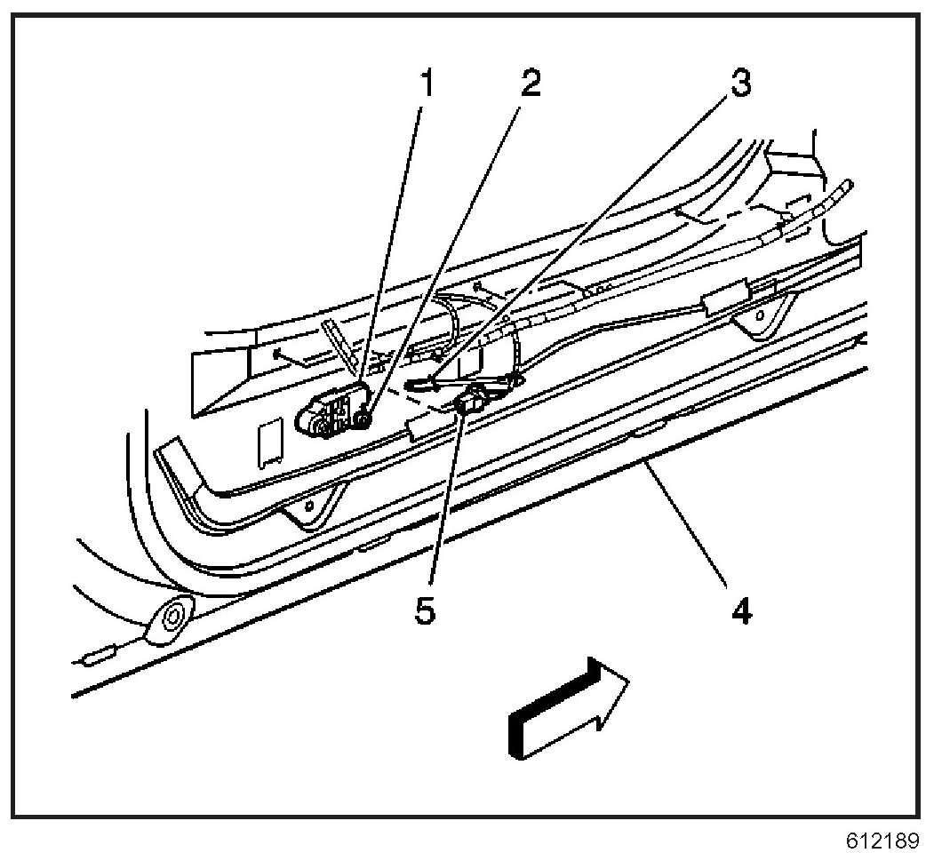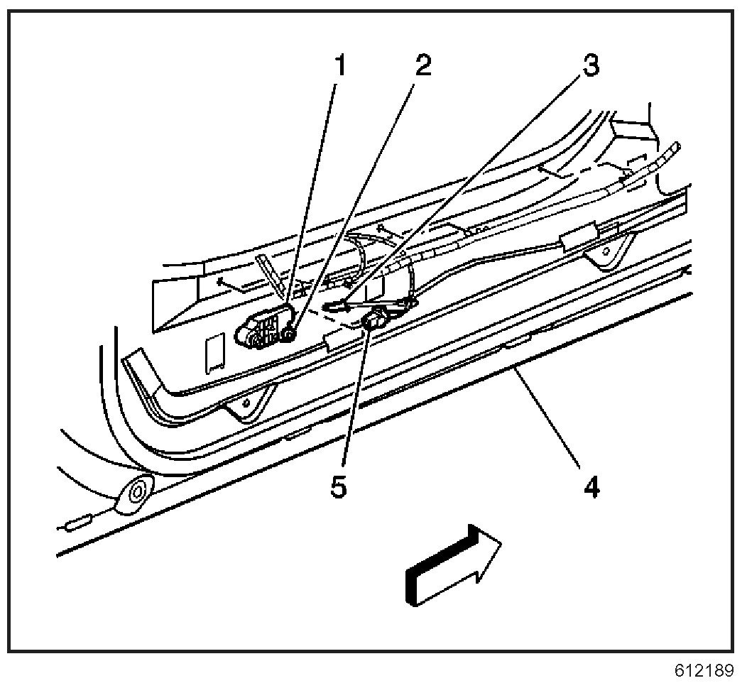 10. Remove the connector position assurance (CPA) (3) from the side impact sensor yellow 2-way connector (5) located near the middle of the door.