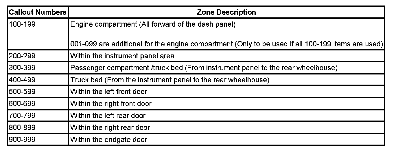 All grounds, in-line connectors, pass-through grommets, and splices have identifying numbers that corresponds to where they are located in the vehicle. The table explains the numbering system.