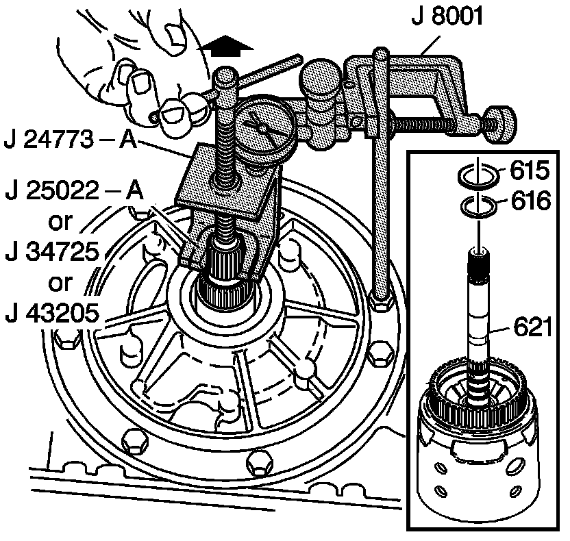 If the dial indicator shows no end play, the selective washer (616) and thrust bearing (615) may have been misassembled.