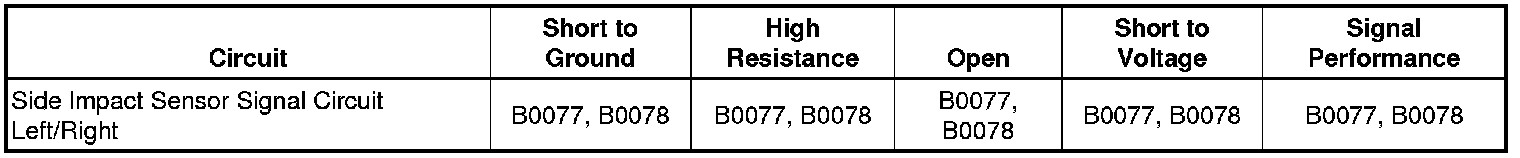 The inflatable restraint side impact sensor (SIS) utilizes a unidirectional 2-wire circuit. The SIS modulates current on the interface to send ID, State of Health, and deployment commands to the inflatable restraint sensing and diagnostic module (SDM). The SDM serves as a power source and a ground for the SIS. When the ignition is turned on and input power from the SDM is first detected, the SIS responds by performing internal diagnostics and sending an ID to the SDM. The SDM considers the ID to be valid if the response time is less than 5 seconds. The SIS continually communicates status messages to the SDM, which determines if a fault is present in the SIS circuit. When a fault is detected, the SDM resets the SIS twice by removing and reapplying power. If the fault is still present, the SDM will set a diagnostic trouble code (DTC).