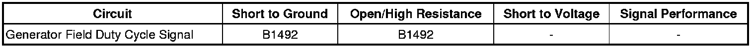 The generator battery control module (GBCM) monitors the generator through the generator field duty cycle signal circuit. The signal is a pulse width modulation (PWM) signal of 128 Hz with a duty cycle of 0-100 percent. Normal duty cycle is between 5-99 percent when the engine is running. If the generator field duty cycle signal circuit is in the 0-5 percent range or pulled low to ground while the engine is running, then DTC B1492 will set.