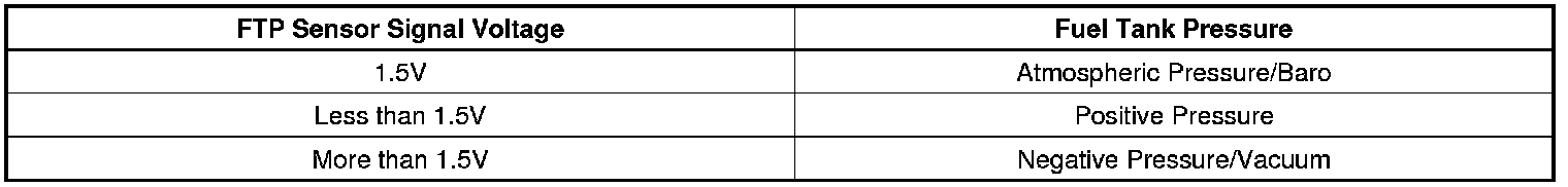 1. Ignition ON and fuel cap removed, verify that the FTP sensor parameter is between 1.3-1.7 volts.