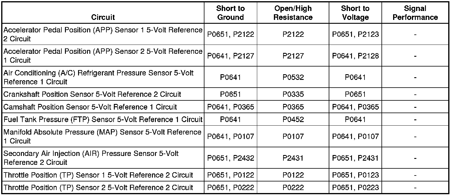 The engine control module (ECM) has 2 internal 5-volt reference busses called 5-volt reference 1 and 5-volt reference 2. Each reference buss provides 5-volt reference circuits for more than one sensor. A fault condition on one 5-volt reference circuit will affect the other 5-volt reference circuits connected to that reference buss. The ECM monitors the voltage on the 5-volt reference buss.