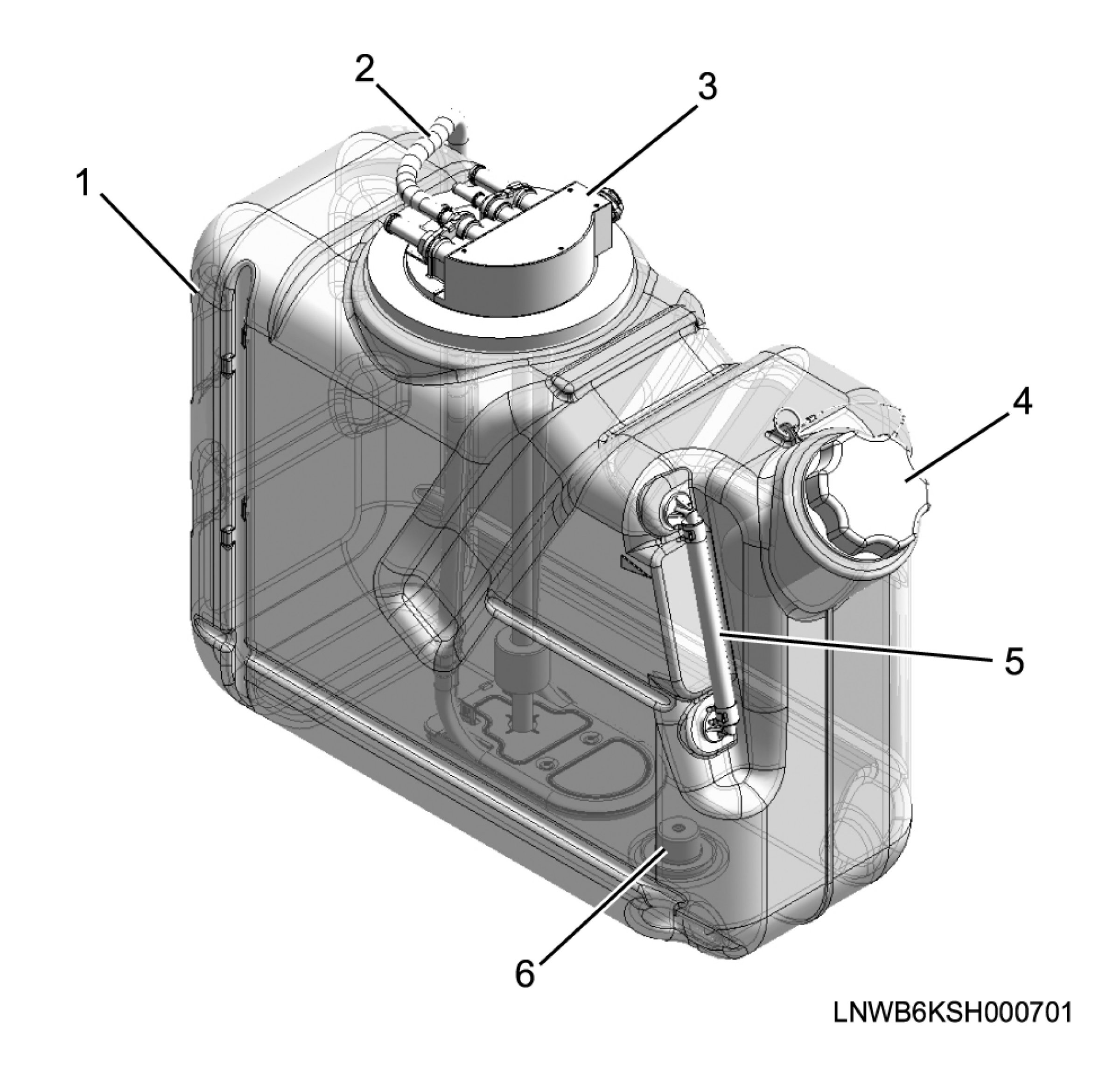 The DEF tank is installed on the frame at the left side of vehicle, and is made of special resin which provides lightweight and robustness. The DEF level sensor is installed inside the DEF tank. The fill port of DEF is designed with a smaller diameter than the fuel feed nozzle to prevent fuel from being fed mistakenly. There is a transparent level gauge installed on the outside of DEF tank to check the fluid level.