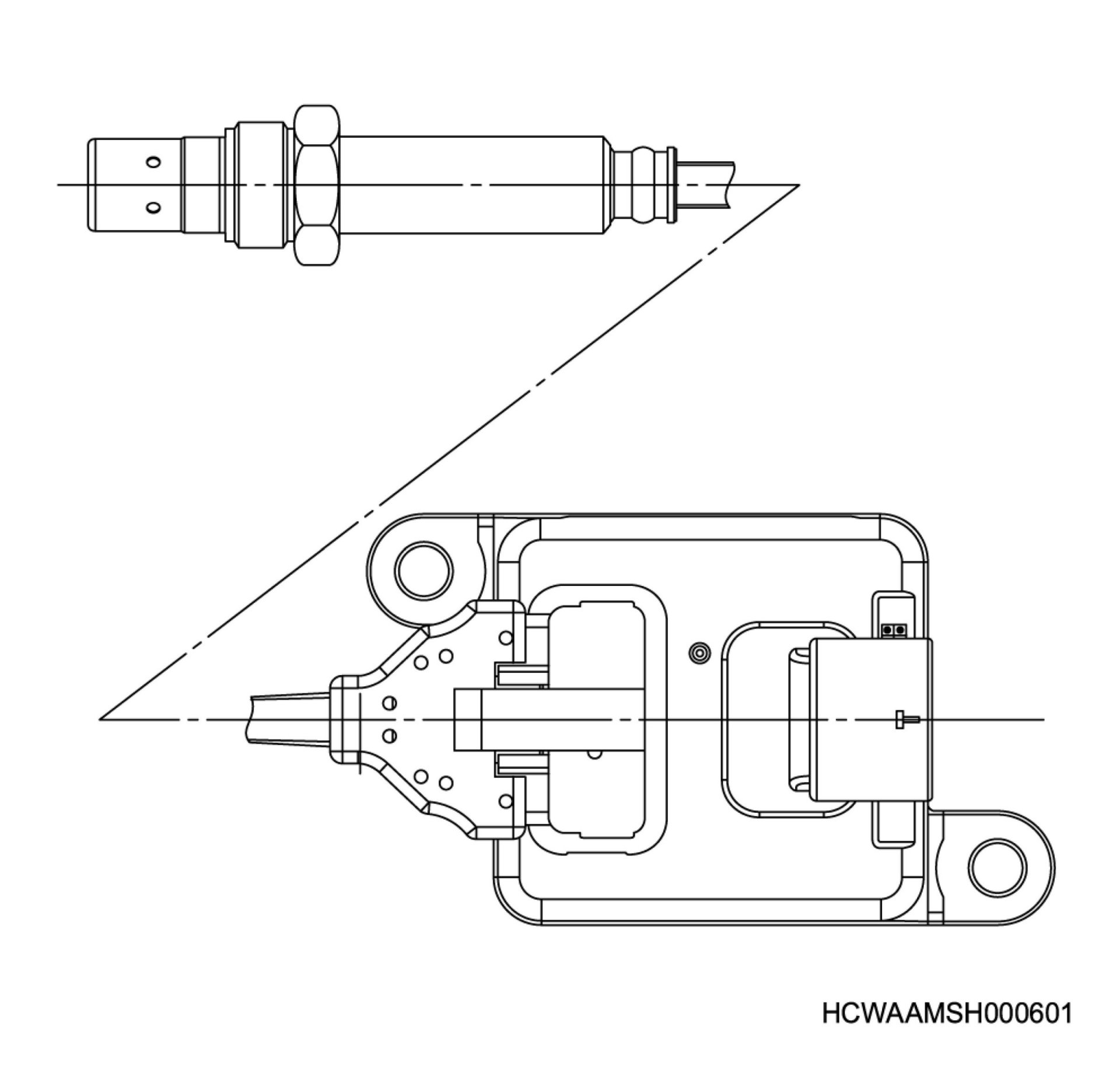 The NOx sensors are installed in two positions, front and rear of the SCR catalyst. The NOx sensor 1 is installed in the SCR catalyst upstream, and detects the NOx concentration exiting from the engine. The NOx sensor 2 is installed in the SCR catalyst downstream, and detects the NOx concentration after NOx conversion by the catalyst. The DEF control module monitors the NOx conversion efficiency using these 2 NOx sensors. Also, signals from the NOx sensors are transmitted to the DEF control module through the CAN circuit. The DEF control module calculates the required DEF injection amount based on the signals from the NOx sensors.